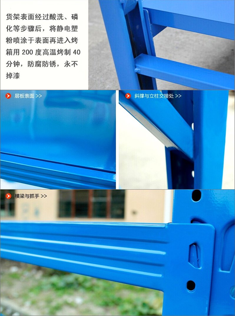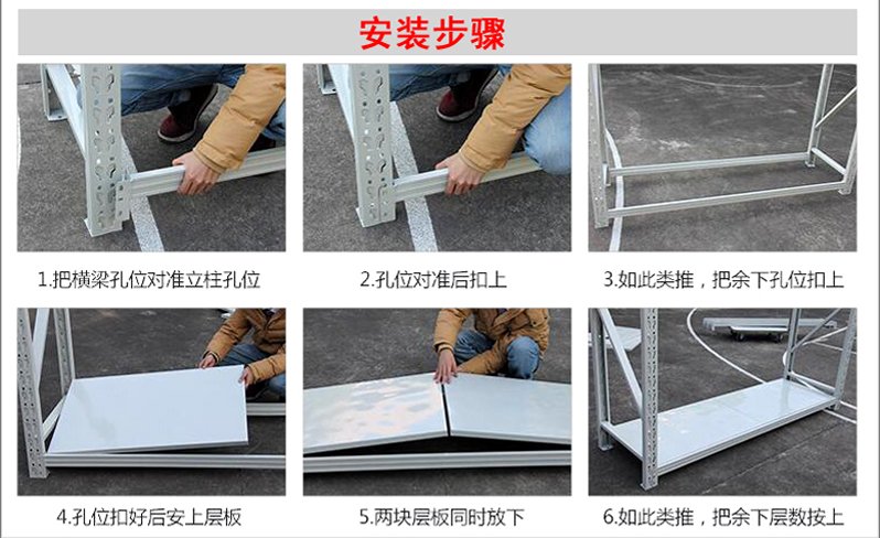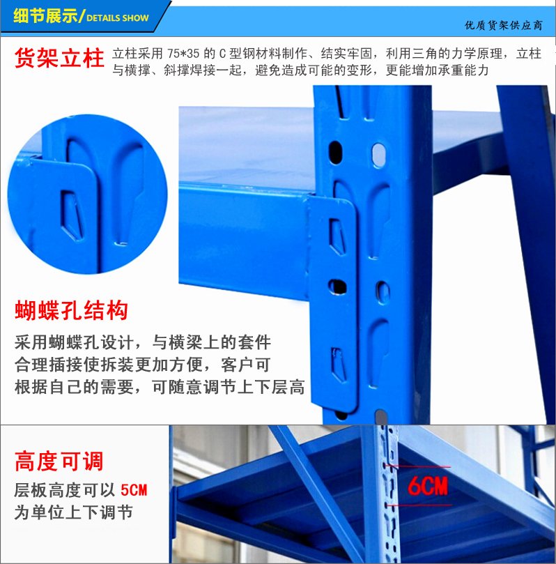 3、层板有木板和钢板可供选择,立柱高度设有每50mm调节孔距,可根据货物高低调节层间使用。