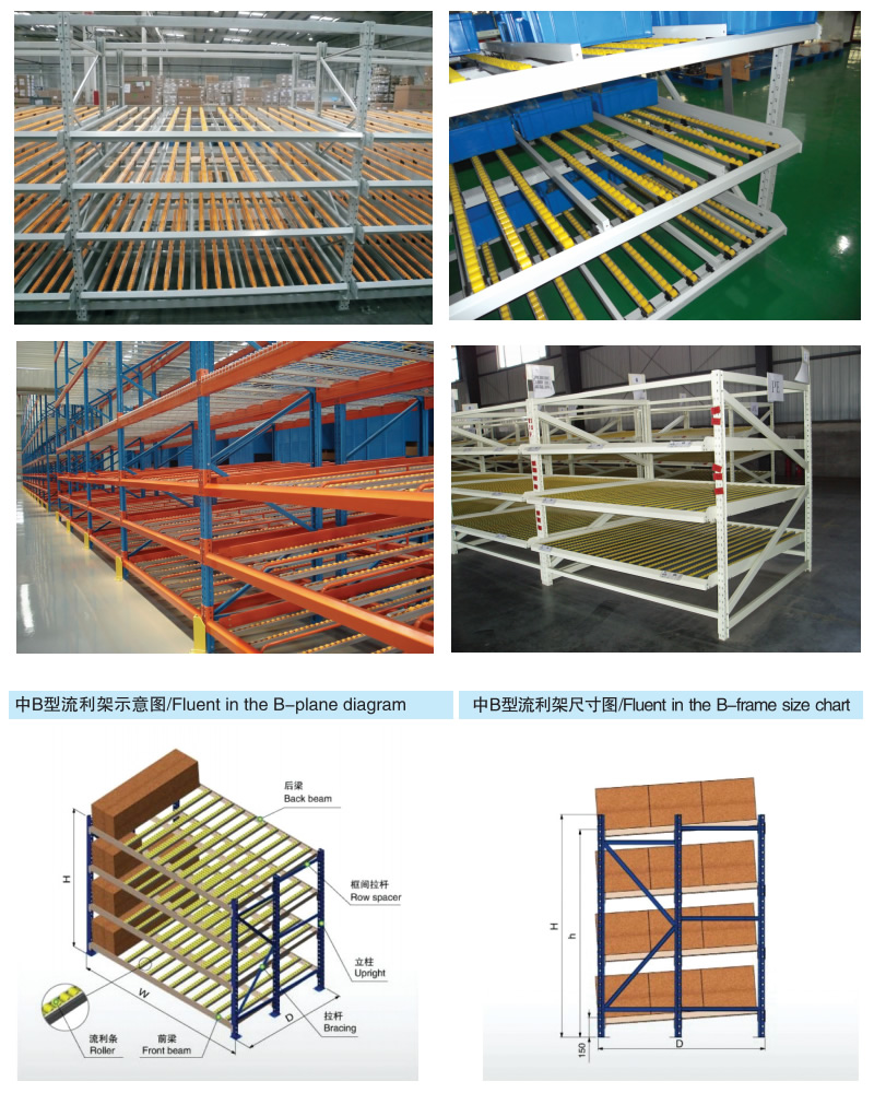 流利式货架根据组成货架的基本框架的材质可分为重型流利式货架和中B型流利式货架。流利货架的流利条直接连接到前后横梁及中间支撑梁上,横梁直接挂在支柱上,流利条安装倾斜度取于货箱的尺寸、重量以及流利架的深度,通常取5%~9%。当滚道较长时,可用分隔板将滚道隔开。取货端需安装制动片使货物减,降低冲击。