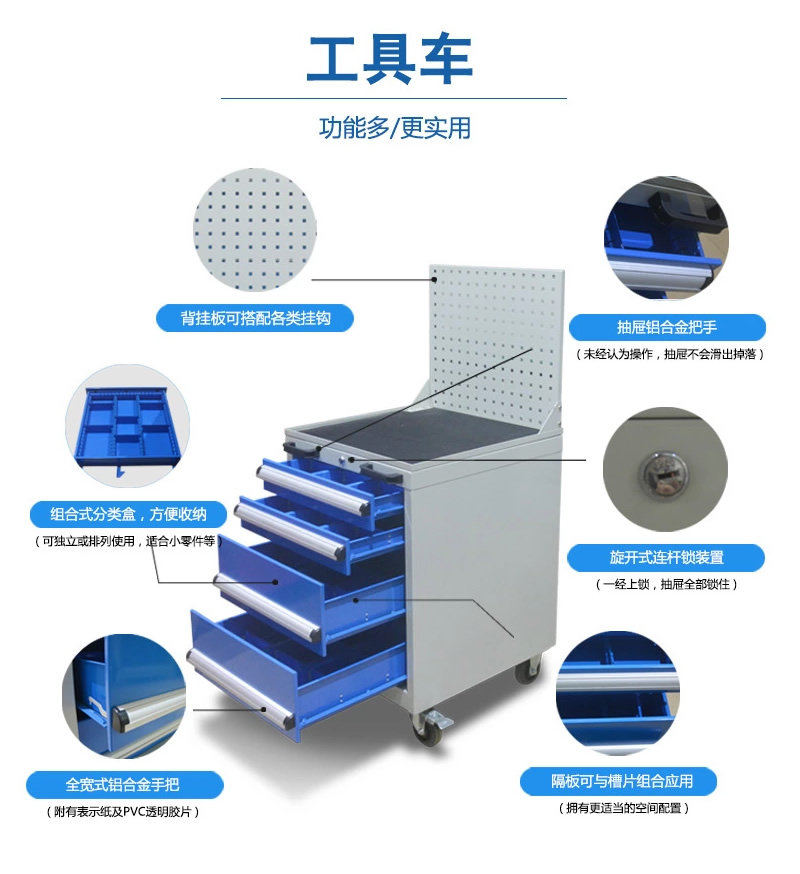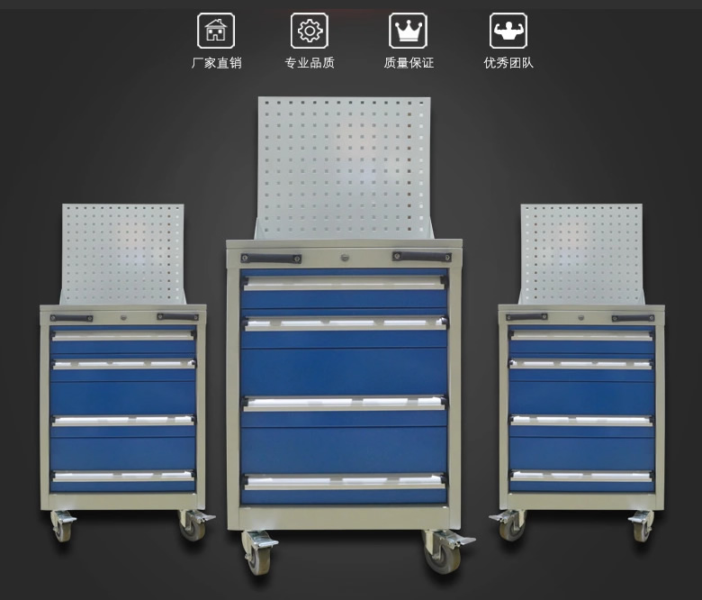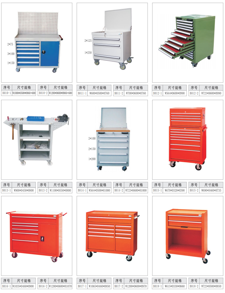 工具车由各种型号的工具柜增加顶柜和脚轮等移动部件组成。